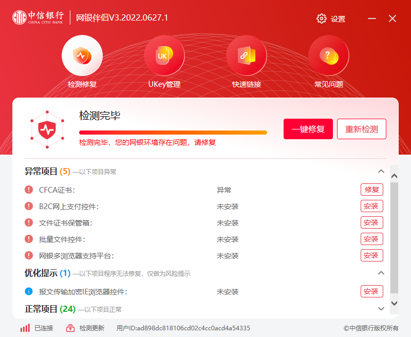 电脑插入U盾后运行网银伴侣,然后点击“立即检测”,检测完成后,点击“一键修复”,可自动安装登录电子对账所需的控件和U盾驱动,安装完成后可访问电子对账登录页进行登录。
