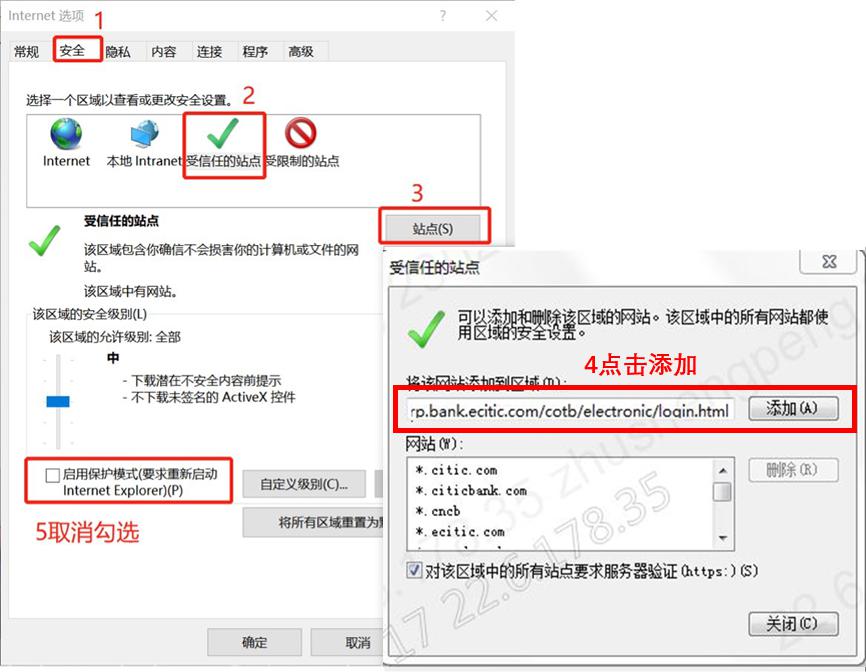 添加https://corp.bank.ecitic.com/cotb/electronic/login.html到浏览器的信任站点中,并取消“启用保护模式”选择项(打开IE浏览器,点击菜单“工具”,打开“Internet 选项”),如下图所示: